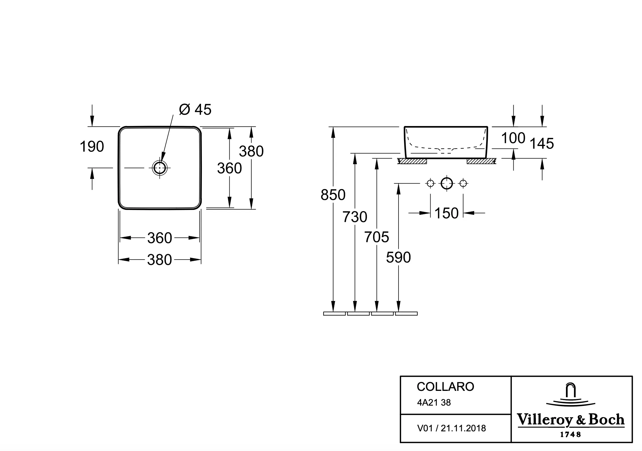 Villeroy & Boch Collaro Раковина для установки на столешницу, 380 x 380 x 145 mm, Альпийский белый, без перелива, нешлифованный 4A213801