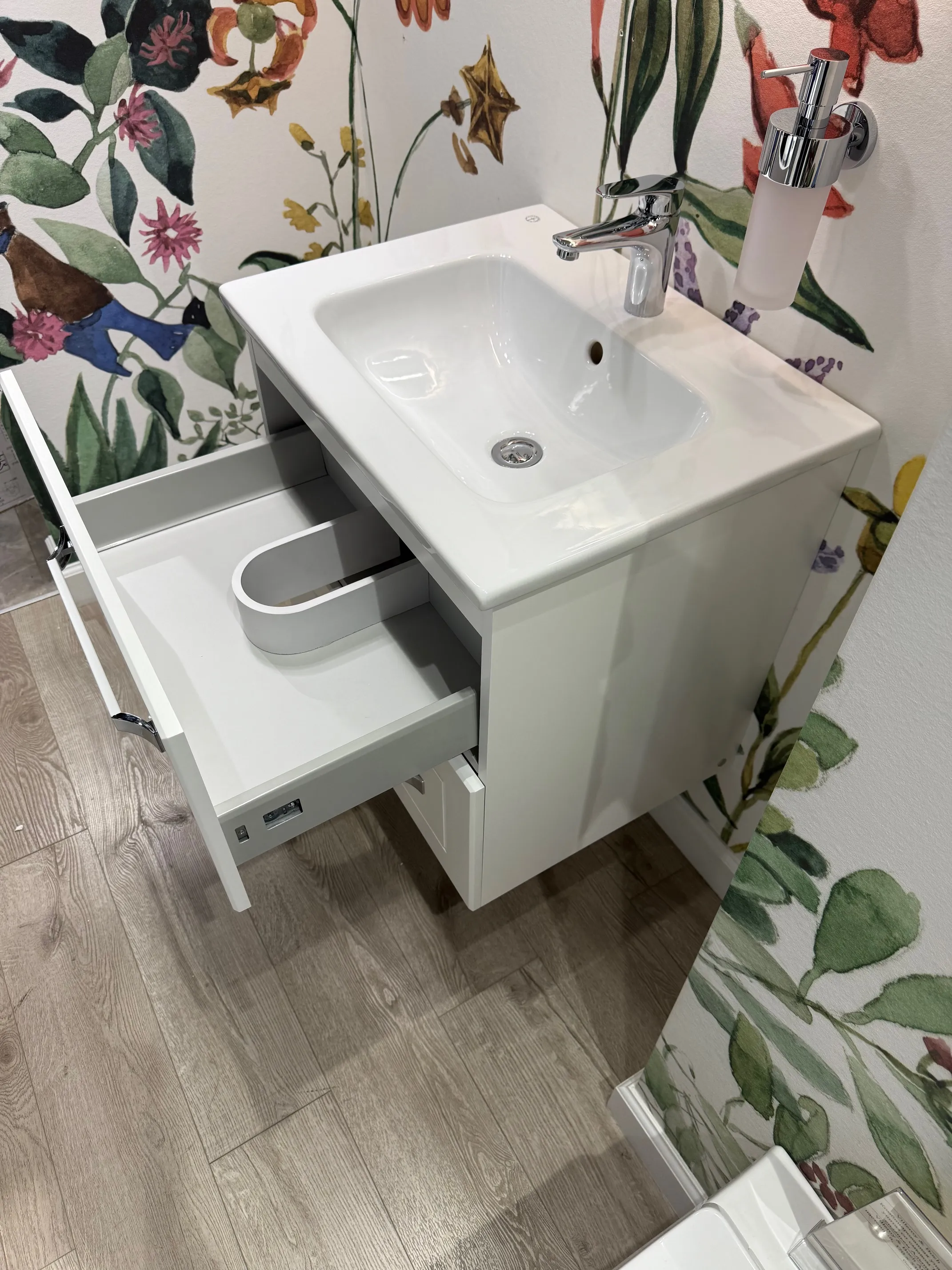 Благодаря современной технологии SoftClosing даже самое резкое закрывание выдвижных ящиков и дверей происходит бесшумно и плавно. Механизм SoftClosing тормозит выдвижной ящик и с помощью автоматического возврата медленно и бесшумно его задвигает — это щадит не только наш слух, но и саму мебель для ванной